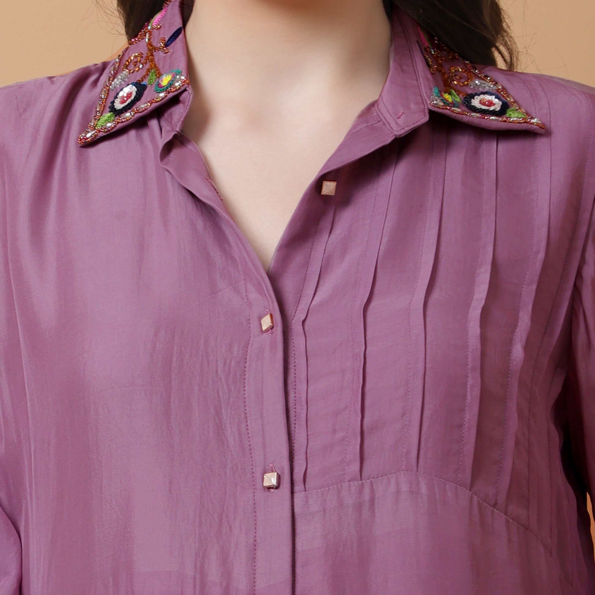 Elevate your style with our Onion Organza Co-Ord. Featuring a stunning onion color and intricate hand work detailing on the collar, front panel, and cuffs. The pleated front panel adds a touch of elegance while the attached lining provides comfort. Elevate every occasion with this unique and stylish Co-Ord.